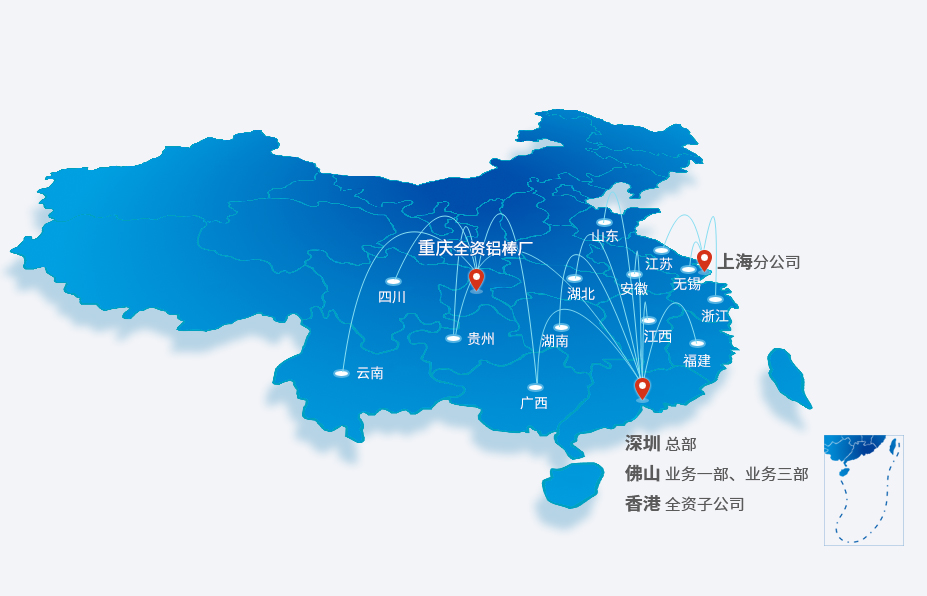 2004年開(kāi)始,北方鋁業(yè)對(duì)銷(xiāo)售網(wǎng)絡(luò)進(jìn)行區(qū)域化布局,抓住市場(chǎng)機(jī)遇,在香港、上海、佛山、重慶設(shè)立了子公司、分公司、業(yè)務(wù)部門(mén)及鋁棒生產(chǎn)基地,發(fā)揮區(qū)域優(yōu)勢(shì)提升經(jīng)營(yíng)質(zhì)量。目前北鋁的銷(xiāo)售網(wǎng)絡(luò)遍布華南、華東、西南三大有色金屬業(yè)務(wù)主要區(qū)域。